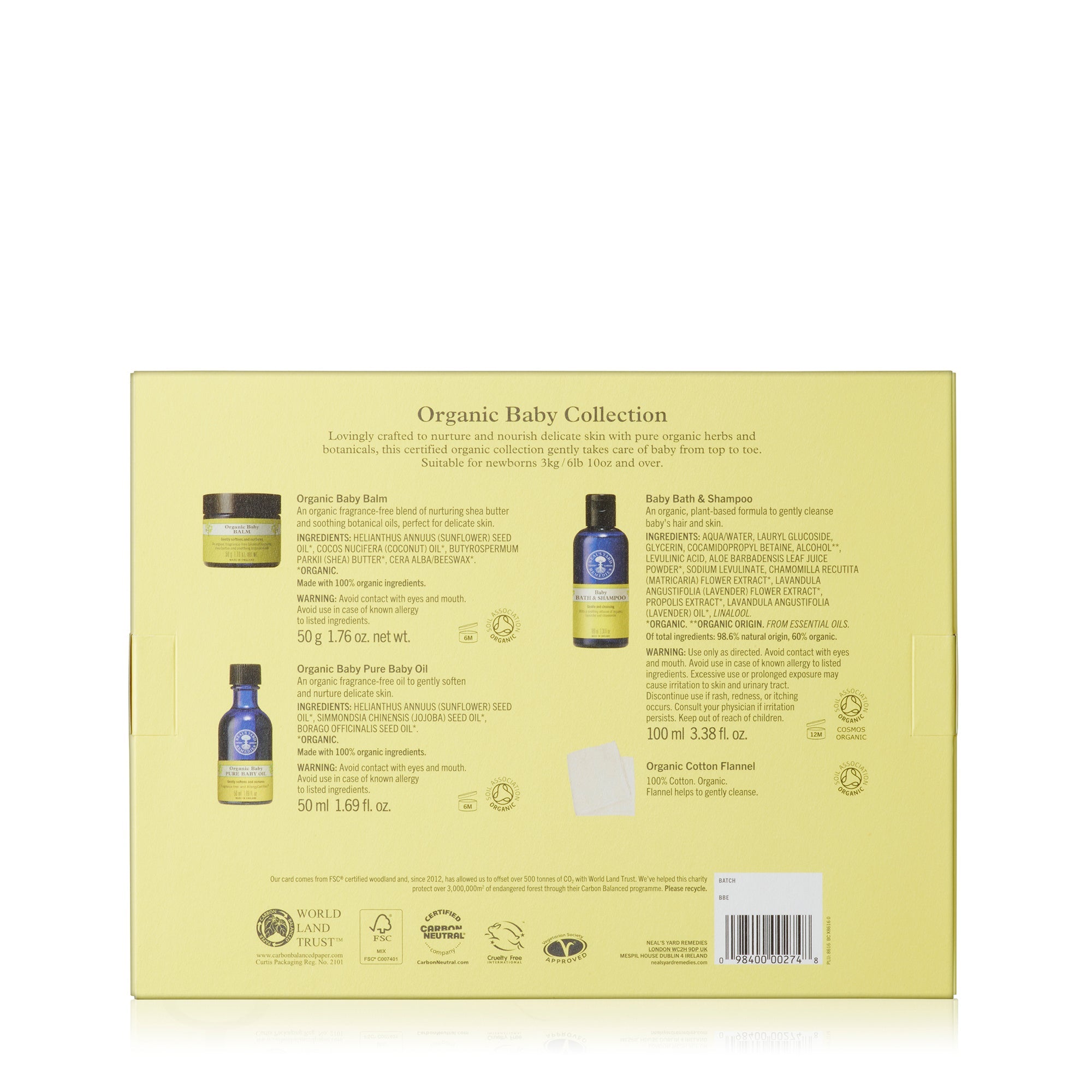 What's inside: Organic pure baby oil, baby bath and shampoo, organic baby balm, and a 100% organic cotton flannel, all formulated with gentle, plant-based ingredients and botanical oils.