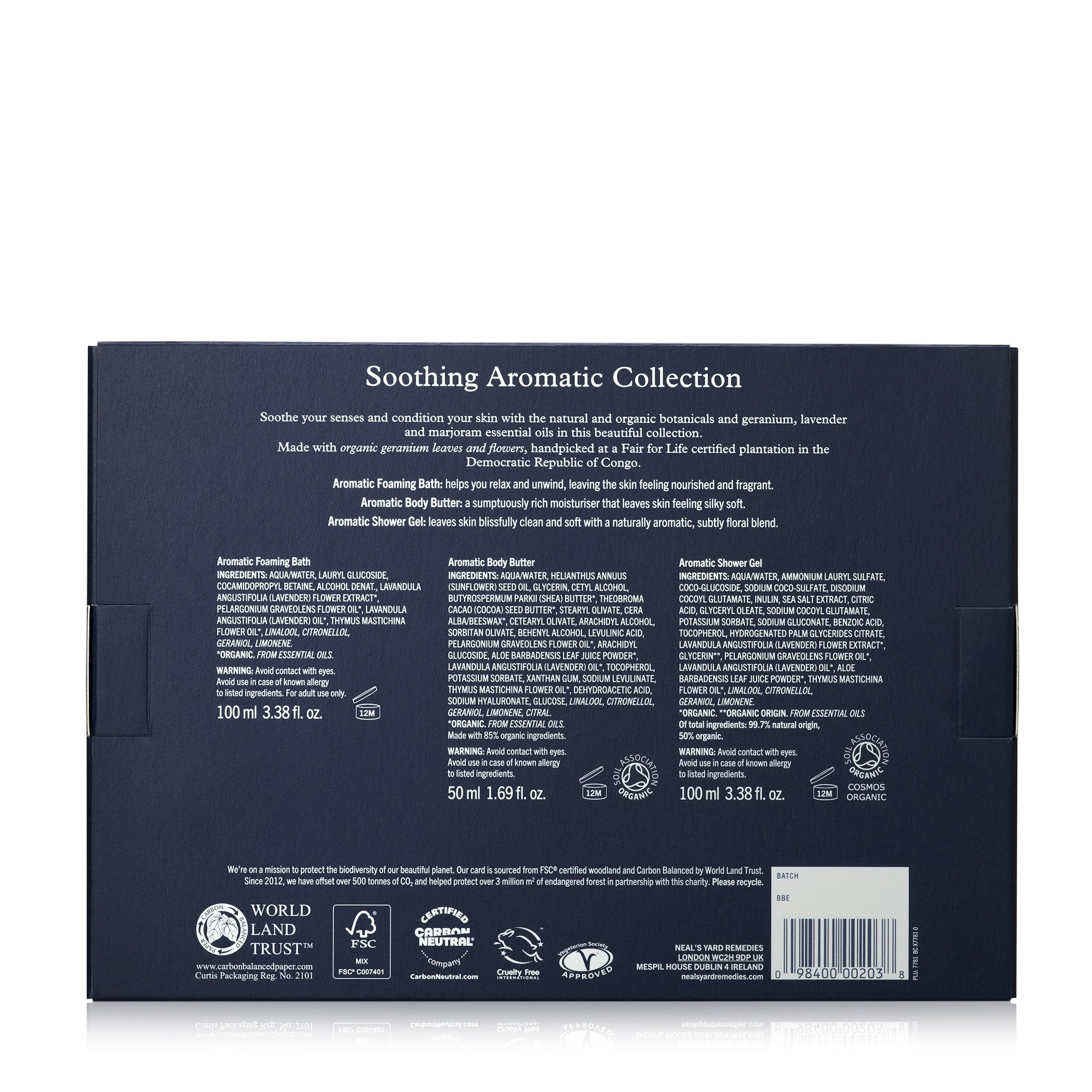 Nourish your senses with this complete bath and body ritual, crafted with a soothing blend of organic botanicals and essential oils. The collection features organic geranium leaves and flowers, handpicked at a Fair for Life certified plantation in the Democratic Republic of Congo, as well as lavender and marjoram to create a calming aromatic experience. Each product is made with care to leave your skin feeling soft, refreshed and with a subtle floral scent.